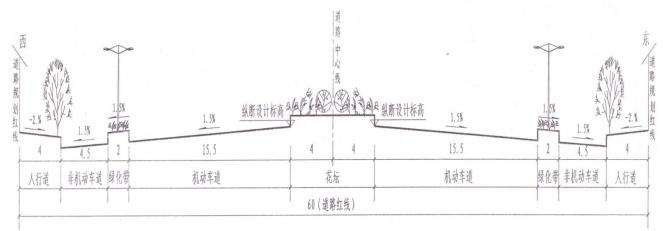说明:经开第二十二大街位于郑州经济技术开发区,道路呈南北走向,规划为城市主干路。道路设计全长938.15米。道路红线标准宽度为60米,标准断面布置为60m(红线)=4m(人行道)+4.5m(非机动车道)+2m(边绿化带)+15.5m(机动车道)+8m(中央绿化带)+15.5m(机动车道)+2m(边绿化带)+4.5m(非机动车道)+4m(人行道)。