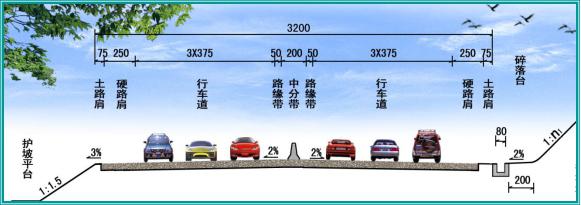京港澳高速现状路基横断面宽度为35.0m,双向六车道,即:(2×0.75m土路肩+2×3.5m硬路肩+2×3×3.75m行车道+2×0.5m路缘带+3m中央分隔带)=35.0m。结合项目实际,京港澳高速保通便道路基标准横断面宽32.0m,双向六车道,即:(2×0.75m土路肩+2×2.5m硬路肩+2×3×3.75m行车道+2×0.5m路缘带+2m中央分隔带)=32.0m。